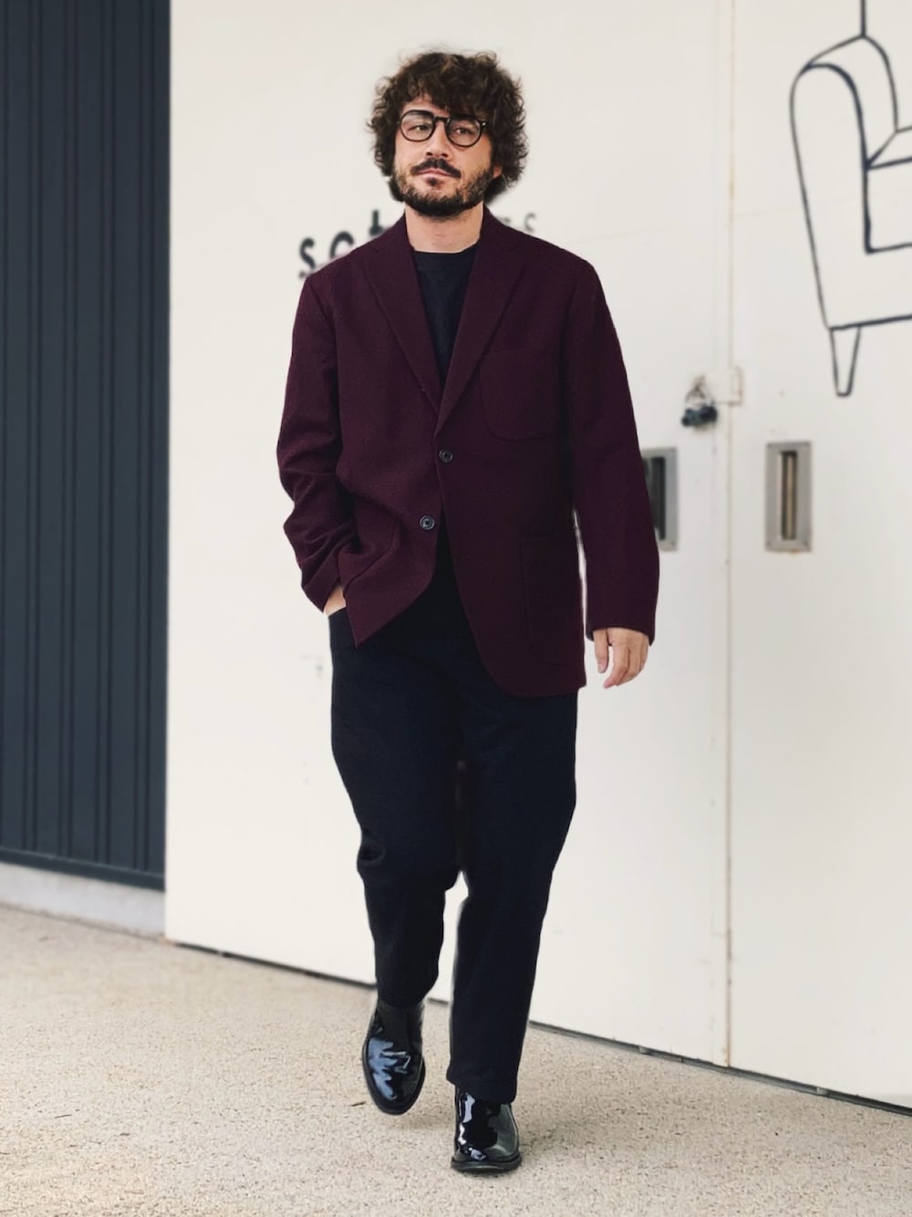 koppaのテーラードジャケット「【sold】+J size M ワイン」を使ったコーディネート