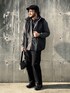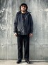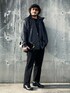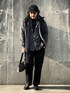 シャツをチャコールグレーにしてオールブラックの重さを緩和。 普段着には十分すぎるスタイリング。