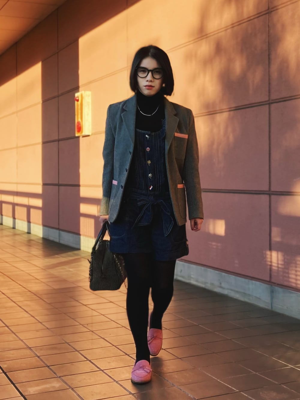 ジャケットのパイピングとローファーのピンクをアクセントカラーにしたサロペットスタイル。 ジャケットはwearフリマを介さずyahooフリマに出品中。