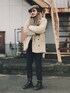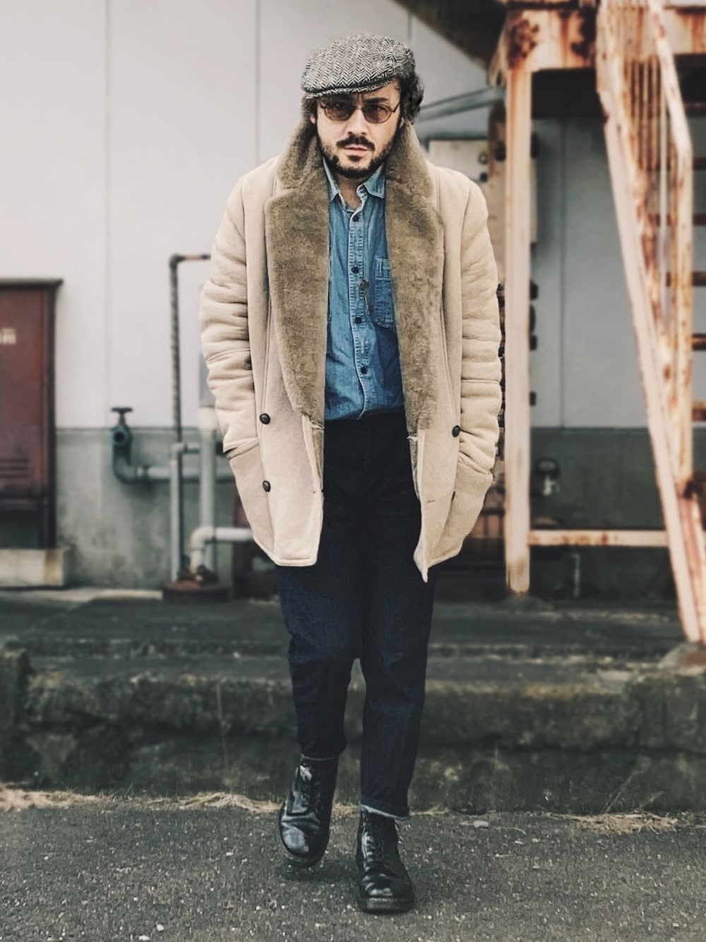 とにかく暖かいリアル羊革のムートンアウター。 上下のトーンを変えたダブルデニム(デニムオンデニム)との組み合わせでシンプルにまとめ。