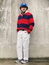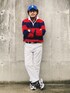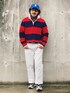ハイコントラストの赤青配色でアメリカンオヤジ的スーパーカジュアルスタイル。 ポイントは首元のレイヤリング。