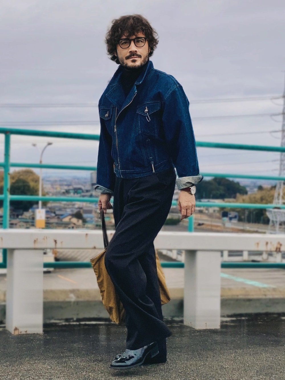 ブラック基調のモードスタイルにデニムライダースとコットントートバッグを合わせてジャンルミックス。