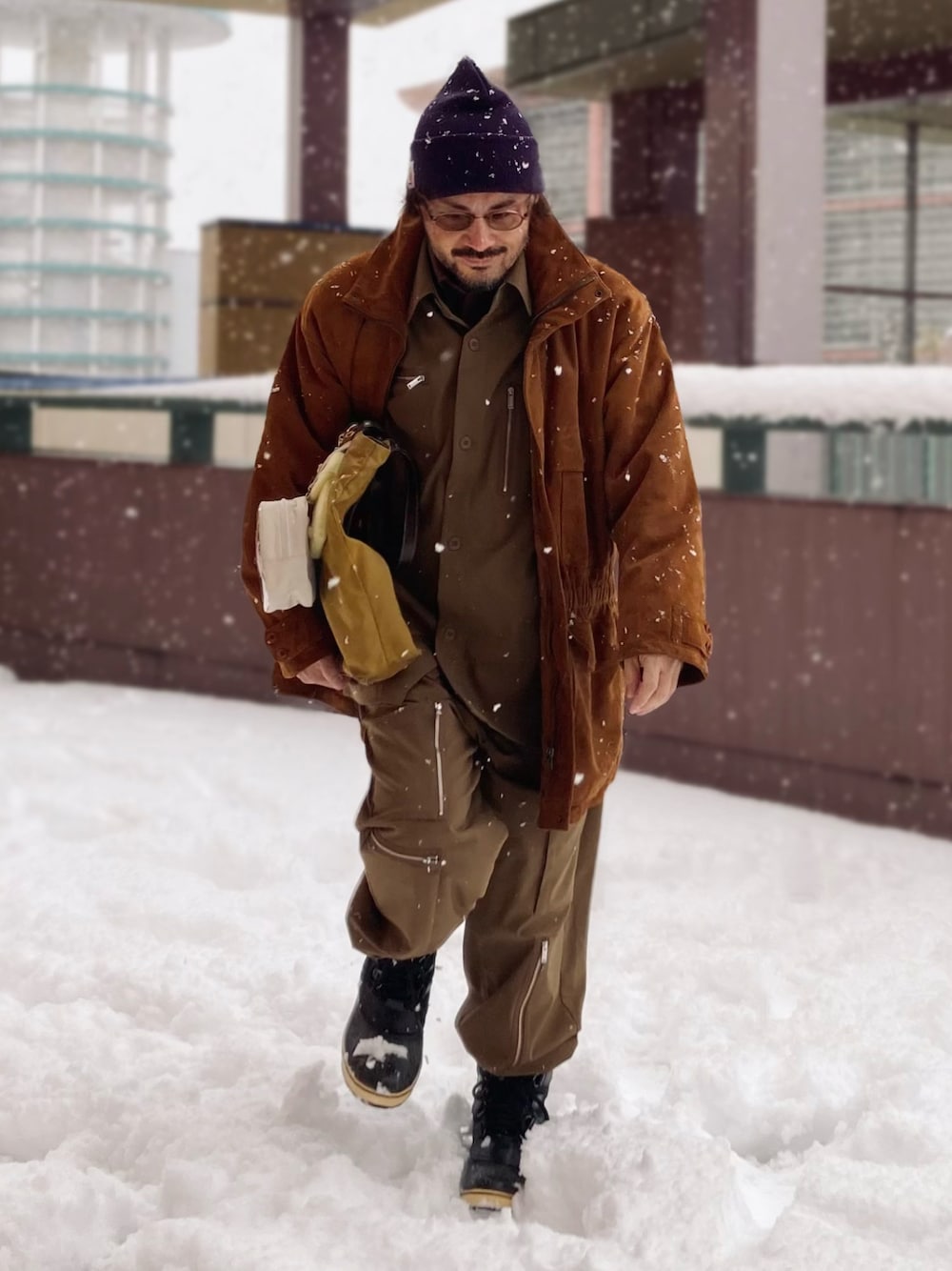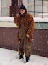 gu × undercover コラボのセットアップでワークストリートスタイルに。 ブラウン系の配色はあまり見かけないので人目につきやすい。