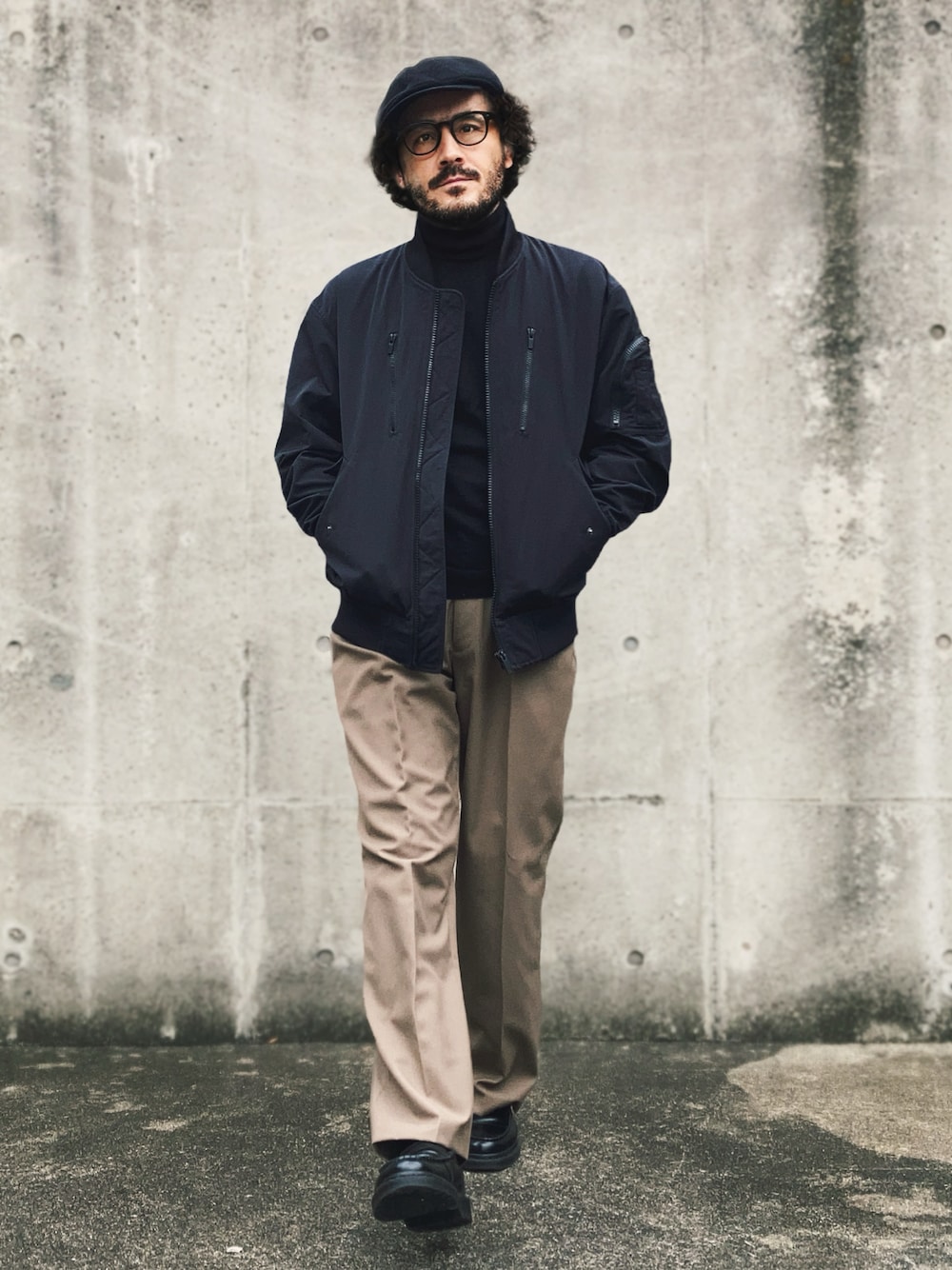MA-1とミリタリーモチーフのスラックス キャスケットとローファーで街着にフィット