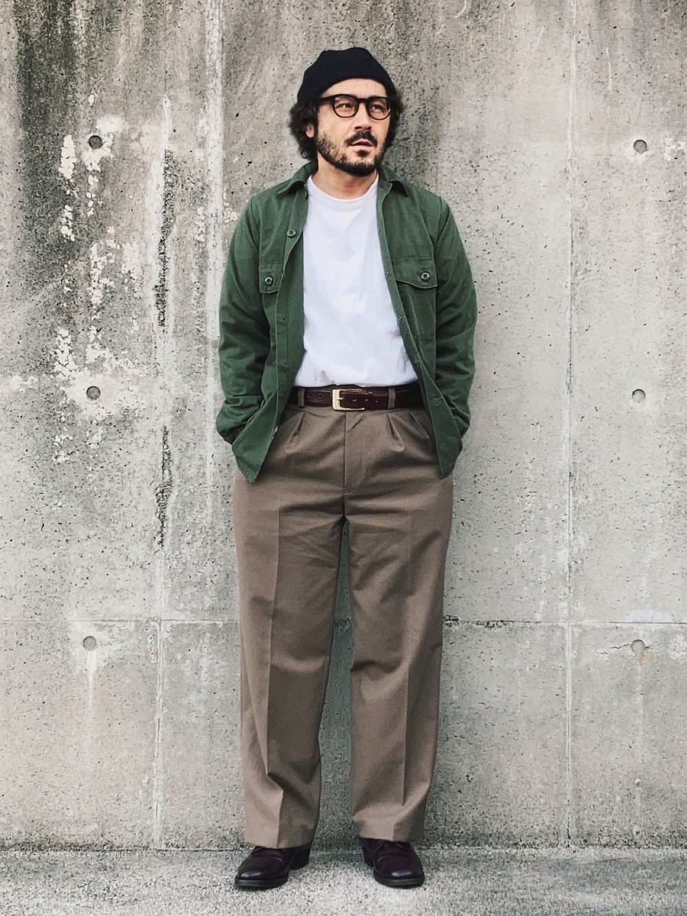 米軍ユーティリティシャツとミリタリーモチーフのスラックス