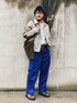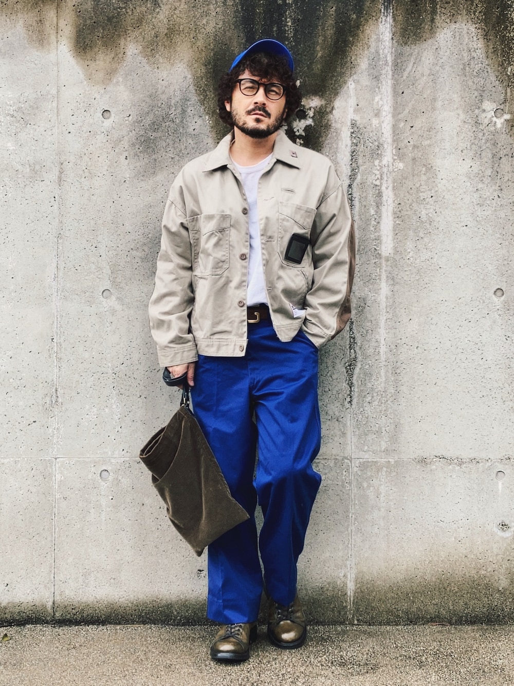 gu × miharaコラボのワークジャケットに作業服のパンツ、モンキーブーツ… ワークスタイルのインナーに白を入れるとタフネスが強調される気がしてなかなか調子いい。