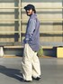 ブルーストライプのロングシャツに白パンツ、スニーカーにミニバッグでお出かけ。