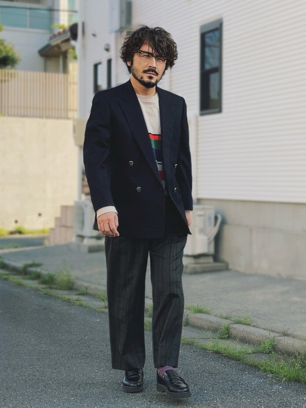バーバリーの古いジャケット インナーにレトロボーダーのロンTを入れてドレスダウン