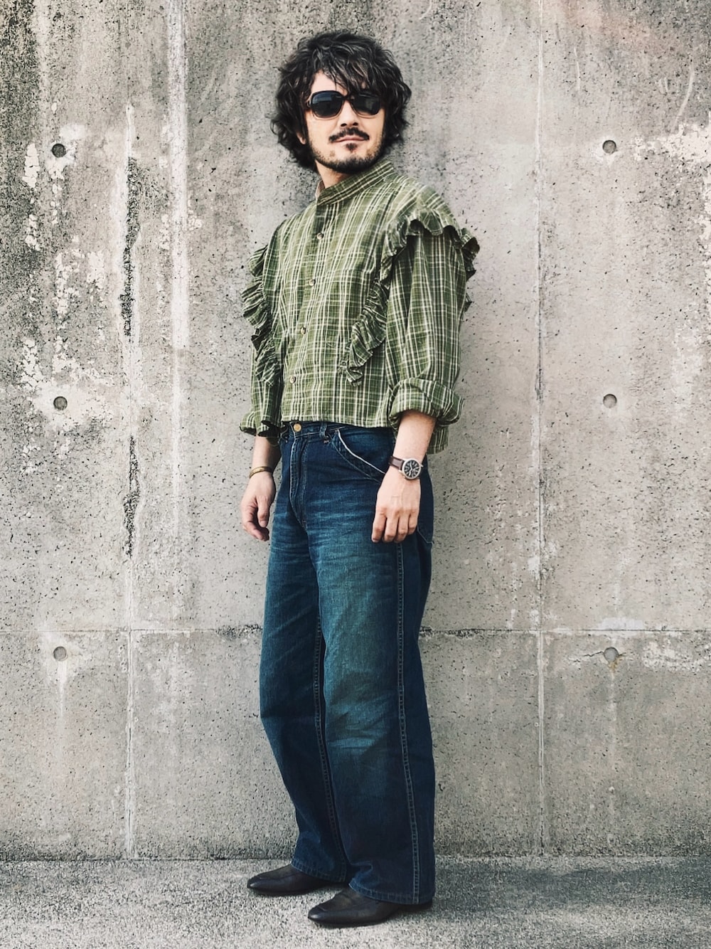 フリルシャツと80sカーハートジーンズ 古着着用率がかなり高いのでドメブラやハイブラのビシッとした生地の服が体質的に合わなくなってきた… ユニクロやGUは新品から古着みたいな感じだからw