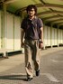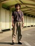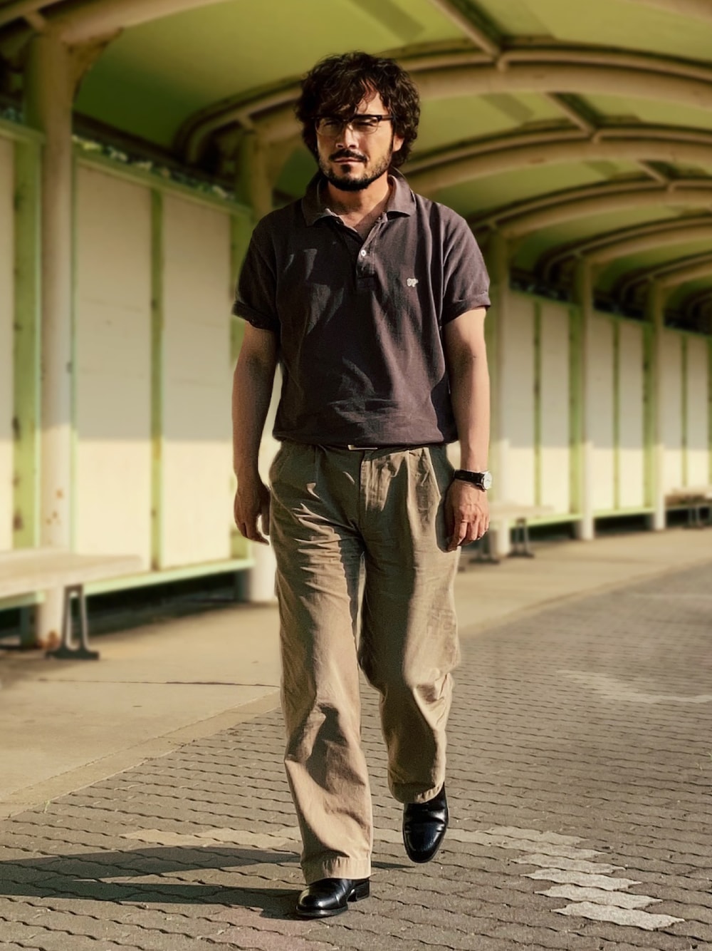 袖のロールアップがポイント 小物のレザーは全て色違い 腕時計バンド:ダークグリーン ベルト:バーガンディ 革靴:ブラック
