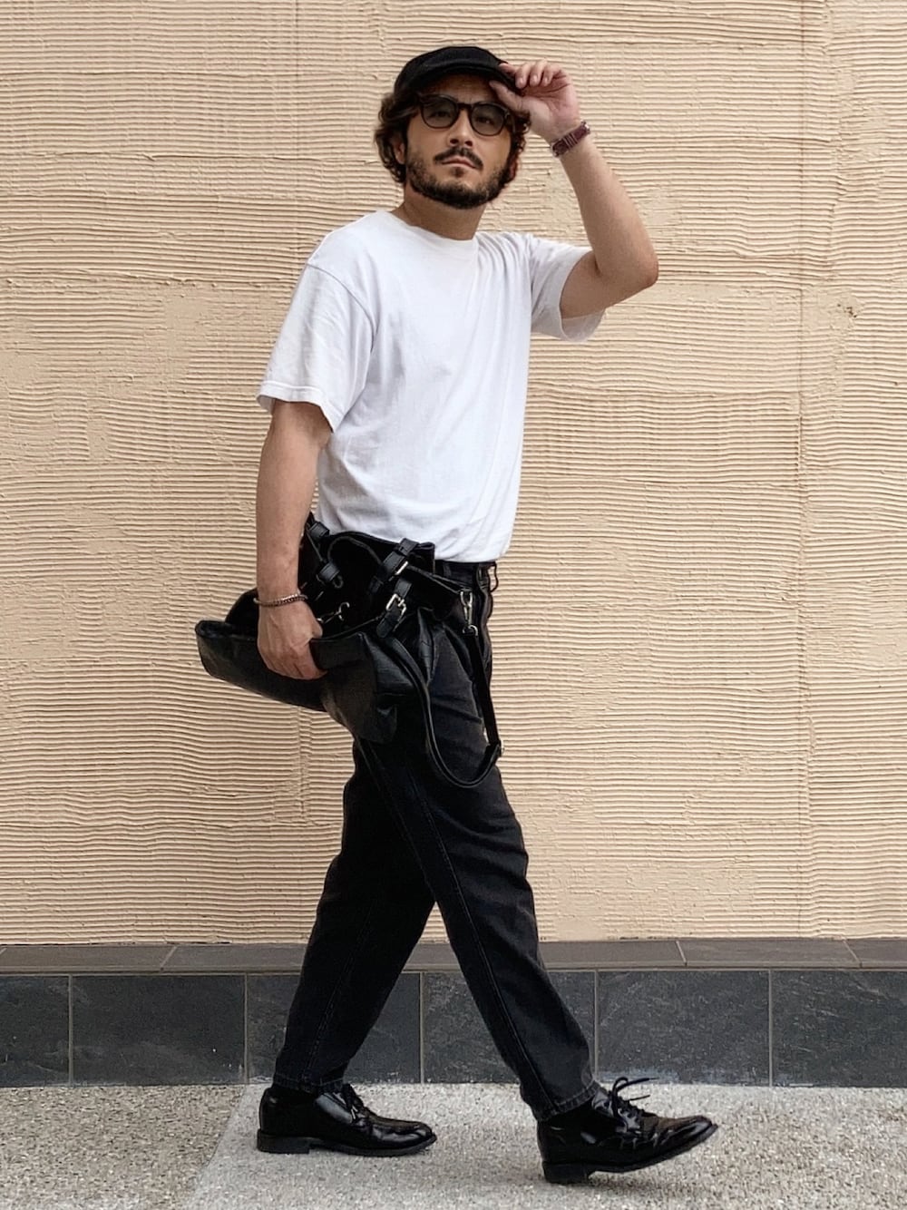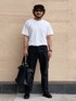 素材もシルエットも無個性な白T&黒ジーンズを小物で装飾