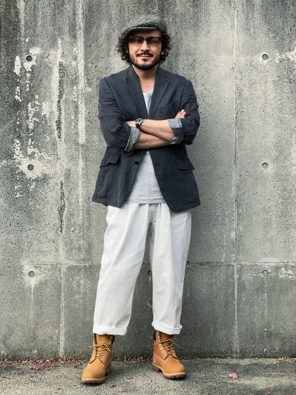 ジャケットスタイルにティンバーランドの定番ワークブーツで抜け感を