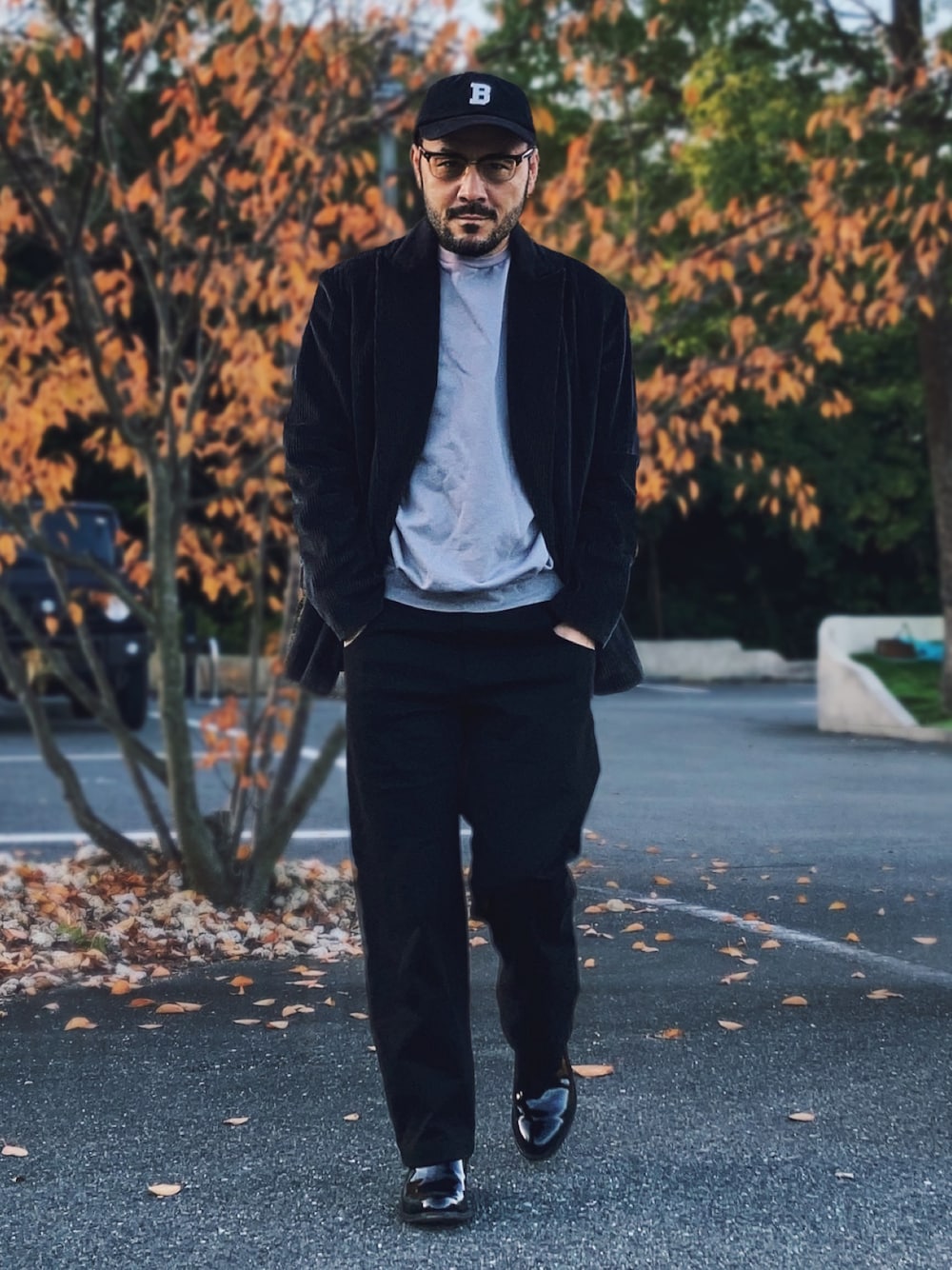 コーデュロイジャケットにコットンパンツ