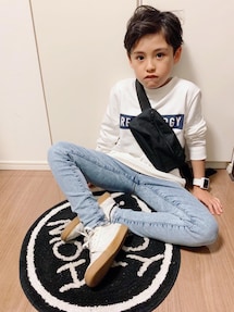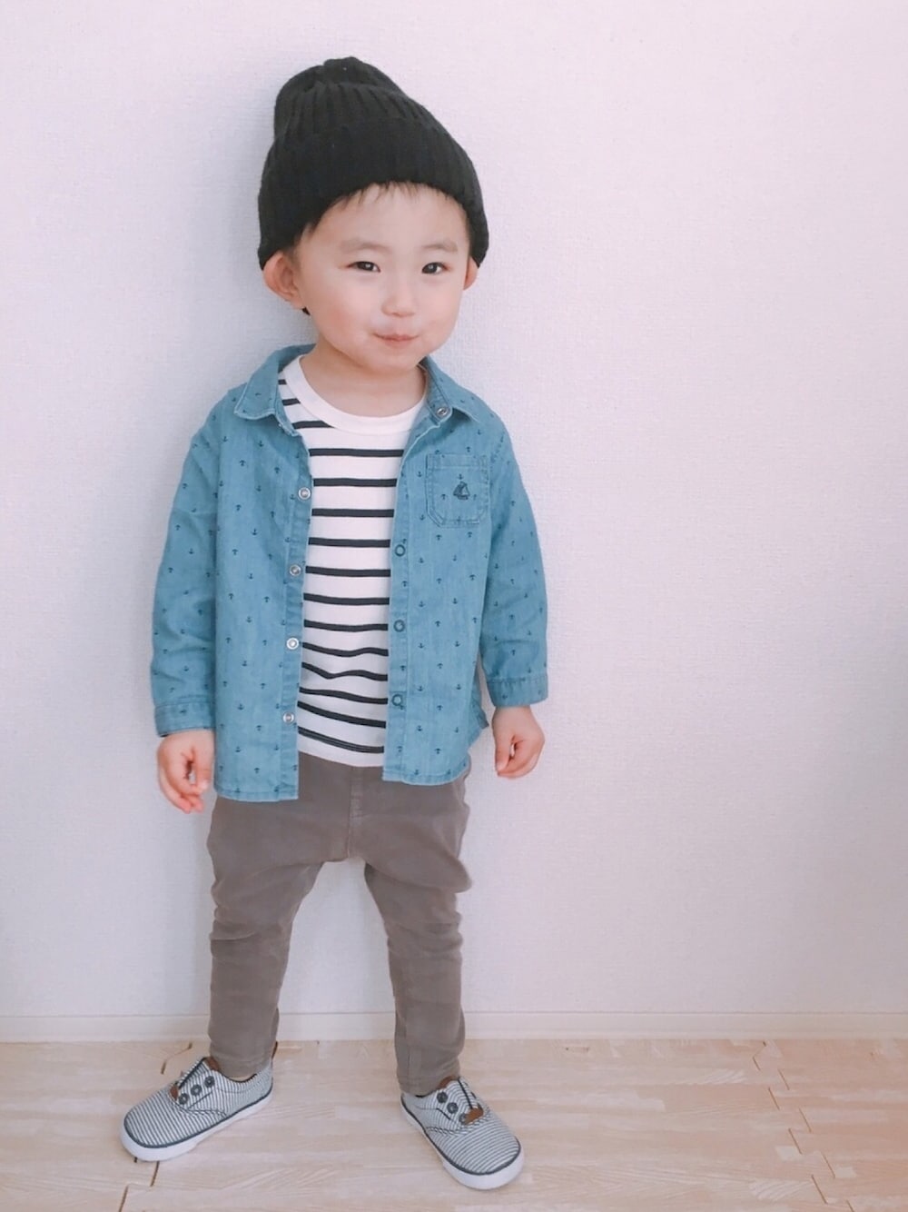 先日バックスタイルpostしたものの 前からver.🐻🌿 暖かくなってきたら ボーダー・デニシャツ・デニジャケを 着せる頻度が高くなってきた☺︎ ボーダーTは首元が白いのが好き💛 ======= ▷2y7m height: 87㎝ weight: 11.9kg =======