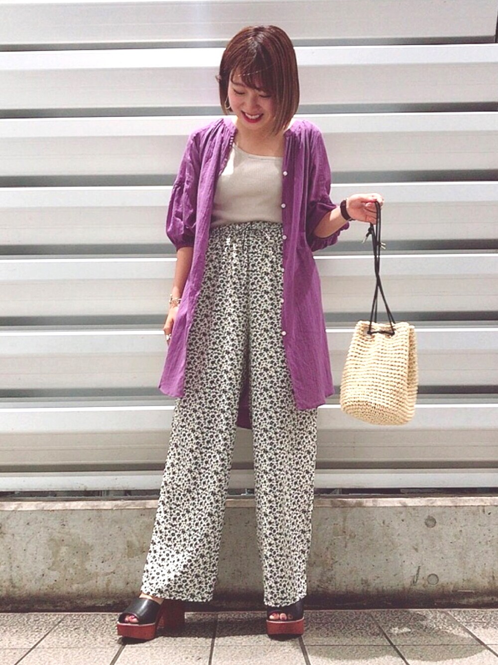 むらさき︎︎︎︎☺︎ イージーパンツをハイウェストで履いて脚長効果に(ت) ミニマムでも履着方次第で変わる!!