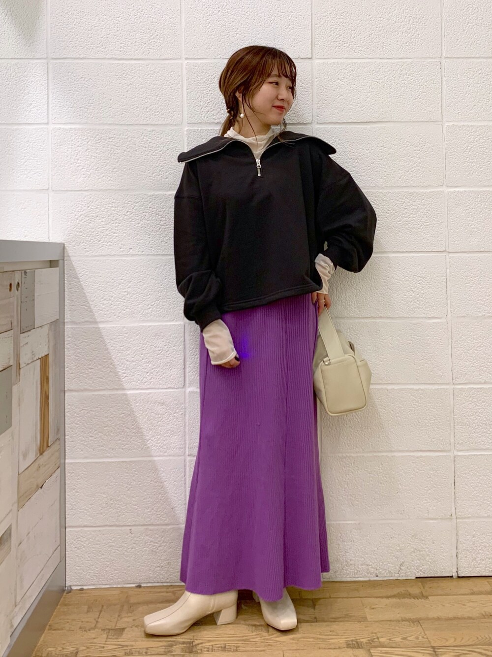 ZIPウラケの着回しコーデ スカートと合わせたデートコーデ! ショート丈の長さなので、ロングスカートとも相性抜群! チュールハイネックを首や袖からチラ見せすると綺麗めな印象に! スカートはフレア型ですがシルエットが綺麗なラインで、カジュアルな生地感ですが綺麗目スタイルでも来ていただけます!