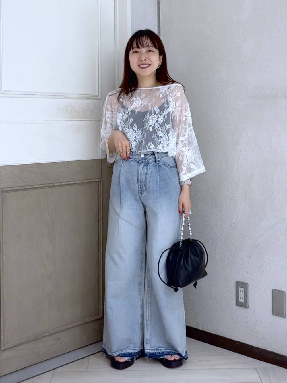 ⭐各アイテムのおすすめポイント  ̄ ̄ ̄ ̄ ̄ ̄ ̄ ̄ ̄ ̄ ̄ ̄ ̄ ̄ ̄ ̄ ̄ 【トップス】 涼しくお洒落見えするレーストップス。 メッシュ素材で通気性抜群! インスタイルもアウトスタイルも、またインナーとしても着ていただけるアイテムです⭐︎ 【ボトムス】 脚長効果ありっ!! 150cmの私でも履ける、タックワイドパンツ。 裾のデザインが変わっているのもオシャレのポイント。 骨格ストレートでインスタイルが苦手ですが、、 このタックワイドパンツなら、タックが入っておりよりスッキリ見えします!