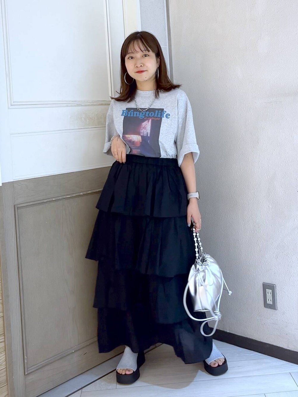 ⭐各アイテムのおすすめポイント  ̄ ̄ ̄ ̄ ̄ ̄ ̄ ̄ ̄ ̄ ̄ ̄ ̄ ̄ ̄ ̄ ̄ 【トップス】 大人気のTシャツ! ビンテージデザインがお洒落な一枚です! 【ボトムス】 トレンド感のあるフリルティアードスカート。 ボリューム感があり、お洒落見え! トップスはコンパクトめのもの合わせると、よりスッキリして履いて頂けます。