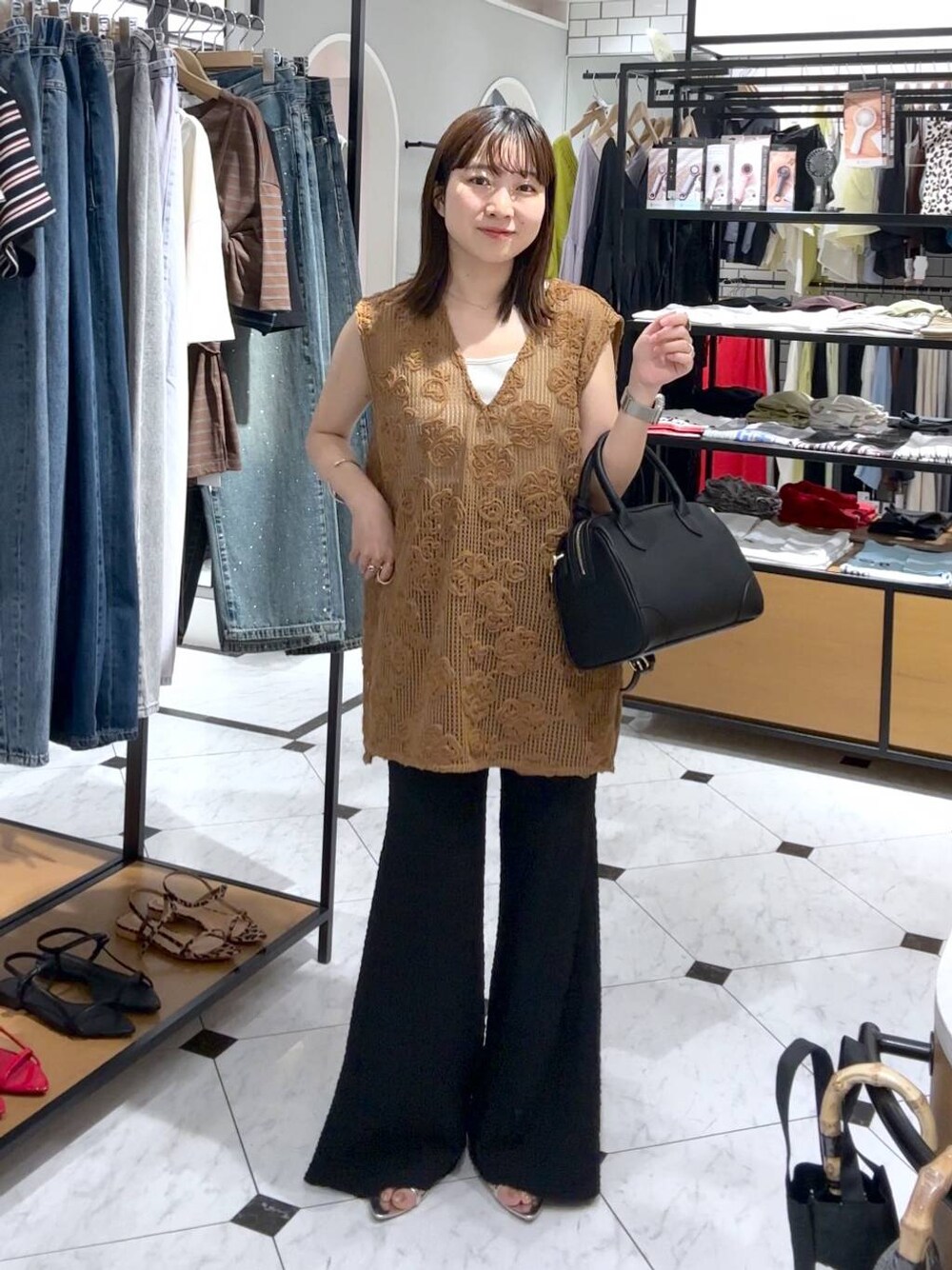⭐各アイテムのおすすめポイント  ̄ ̄ ̄ ̄ ̄ ̄ ̄ ̄ ̄ ̄ ̄ ̄ ̄ ̄ ̄ ̄ ̄ 【トップス】 お店でも大人気の3Dベスト! チュールのお花柄が程よく大人可愛い、、、 ブラウンの色味ですが、濃すぎずお洒落な一枚です! 【ボトムス】 楽ちんに履けるフレアパンツ。 ウエストから足先まで伸びる素材なので、全体的に楽に履いて頂けます! フレアの形で足のシルエットも綺麗に! 少し長めなので150cmの私は1折して履いています!
