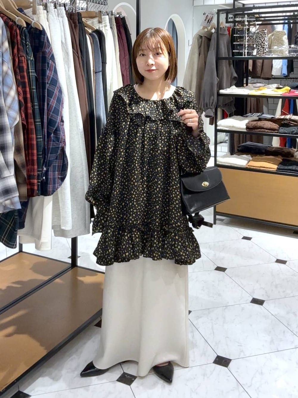 ⭐各アイテムのおすすめポイント  ̄ ̄ ̄ ̄ ̄ ̄ ̄ ̄ ̄ ̄ ̄ ̄ ̄ ̄ ̄ ̄ ̄ 【トップス】 人気のフリルブラウス! ボリューム感があってお洒落見えする一枚。 腰回りまでしっかり隠してくれるので、可愛い中にも安心感があります! 【ボトムス】 今年トレンドのゆるっとスカート。 裾の部分をたるませる長さがおすすめ! 身長150cmで腰で履いてこの長さ! もう少し裾上げたい方は、ウエストで履くと◎