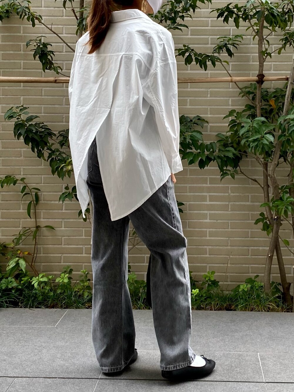 後ろが可愛いシャツと、こなれ感なブラックデニム 最近デニムはブルーより断然ブラック派 インスタ @kc_coordinate