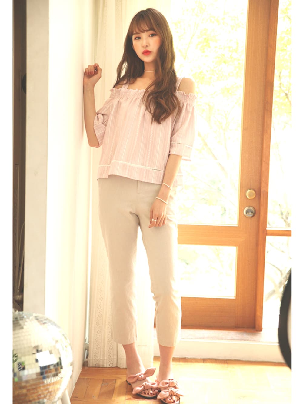 kormarchのシャツ/ブラウス「ストライプレースポイントオフショルダーブラウス」を使ったコーディネート