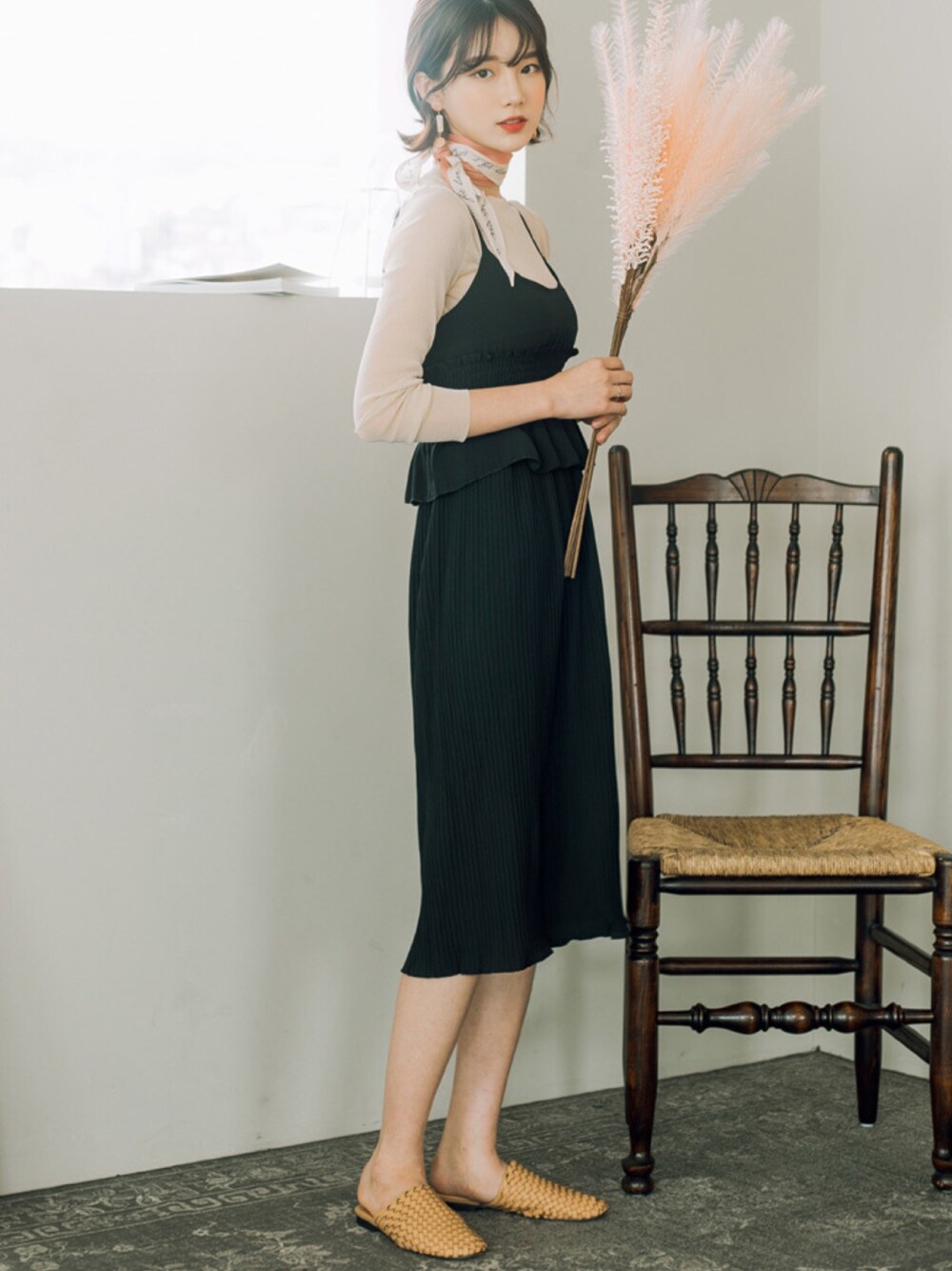 【ウエストゴムマークプリーツワンピース】 カワイらしいオールインワンタイプのワンピース登場。 楽ちんで腰周りはゴム仕上げです。 ウエストをマークしたすっきりフォルム。 ニットカーデやカジュアルなアウターを羽織ってもOKで モデルのようにプチスカーフなどを演出すると ロマンチックなムードに完成です。