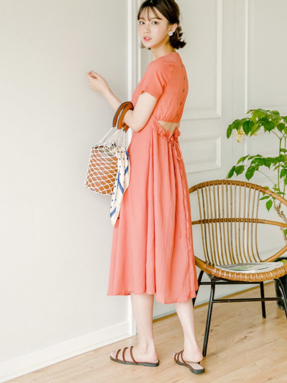 【ウエストバッグカットロングワンピース】 ウエストバックがカットされ ユニークなワンピース。 背中はストリングディテールで 安定感も与えています* 大人な長い丈感も魅力的。 フレアスカートデザインが爽やかな印象もあり、 夏にピッタリな半袖ワンピースです。