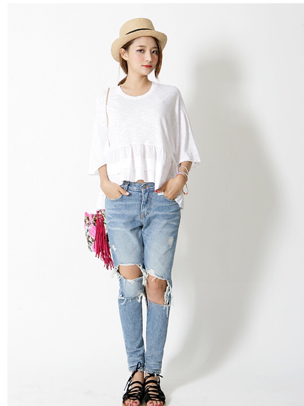 【カットアウトフリルスリーブTシャツ】 シンプルなラッフルスリーブのTシャツ。綿とモダールの混紡素材で、滑らかな肌触りが魅力的なアイテム。ホワイト、ブラックの2色展開です。全体的にシンプルなデザインで、フェミニンさが感じられます。 #無地 tシャツ #レディース #半袖 #ワイドハーフスリーブ tシャツ 税込3089円 #楽天#コマチ#ootd#kormarch#今なら送料無料♡