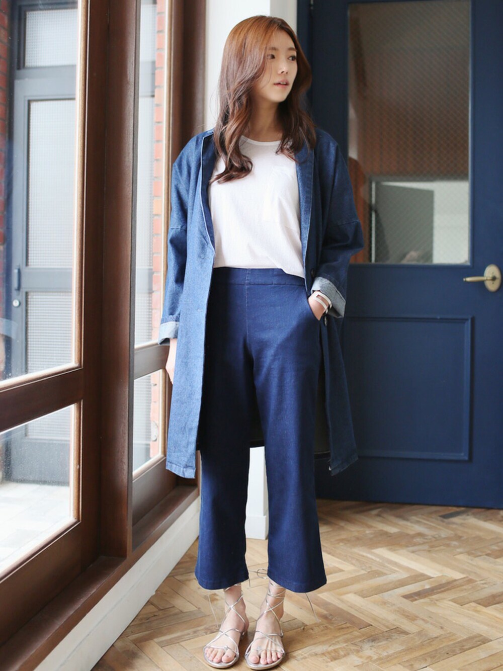 kormarchのピーコート「クラッシュデニムロングJK」を使ったコーディネート