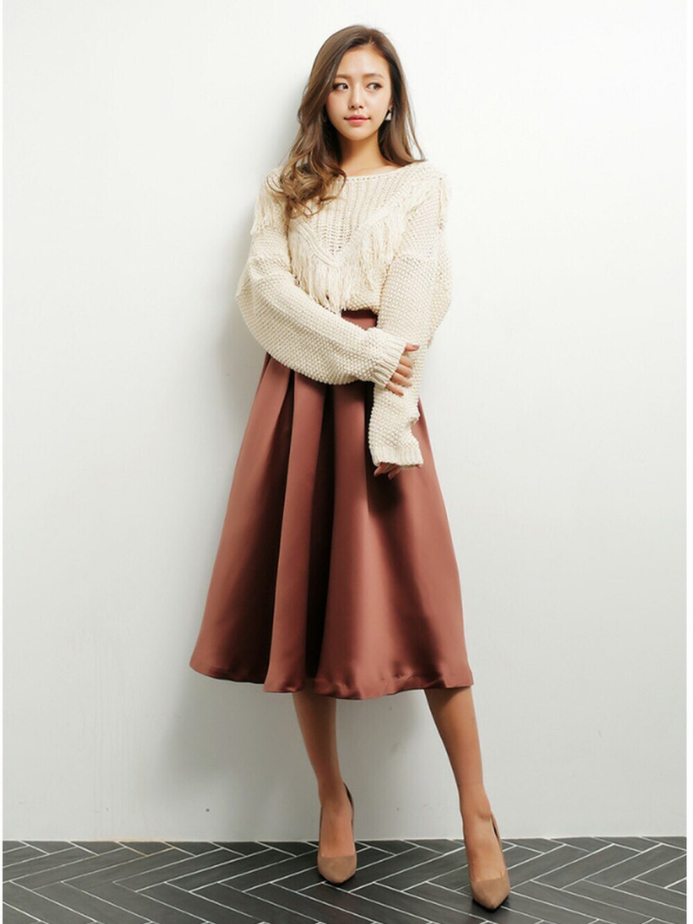 【フリンジニットプルオーバー】 フロントにフリンジデザインをあしらったニット。 単色仕様ながらも、フリンジが着こなしのアクセントになります。 程よくゆとりを持たせたシルエットがフェミニンな印象に。 トレンドのフリンジアイテムは、手軽に今年らしい雰囲気を演出してくれます。 一枚で着用頂くのは勿論、インナーとしてお使い頂くのもオススメ。 ニットよりも軽く柔らかい素材で着心地がいいのも特徴。 今季はハットやスニーカーなど、小物で遊びを効かせたコーディネートもオススメです。 【タックギャザースカート】 大人フェミニンなシルエットをつくる落ち感素材で、エレガントに着こなせる秋顔スカート 商品コード : k1639sk03 価格 : 6,814円(税込)