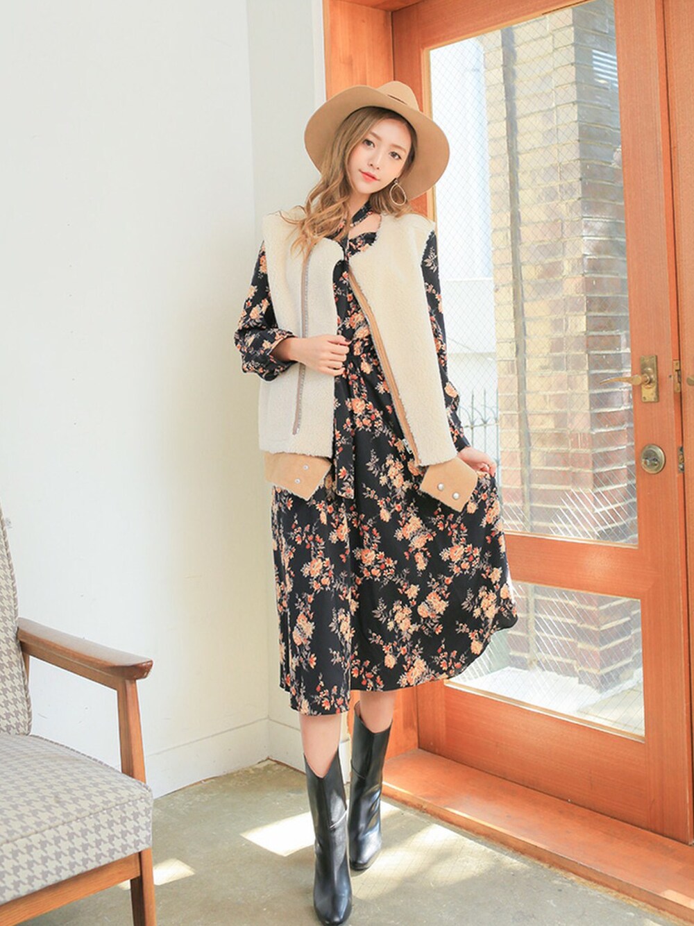 kormarchのワンピース「もこもこジップアップベスト」を使ったコーディネート