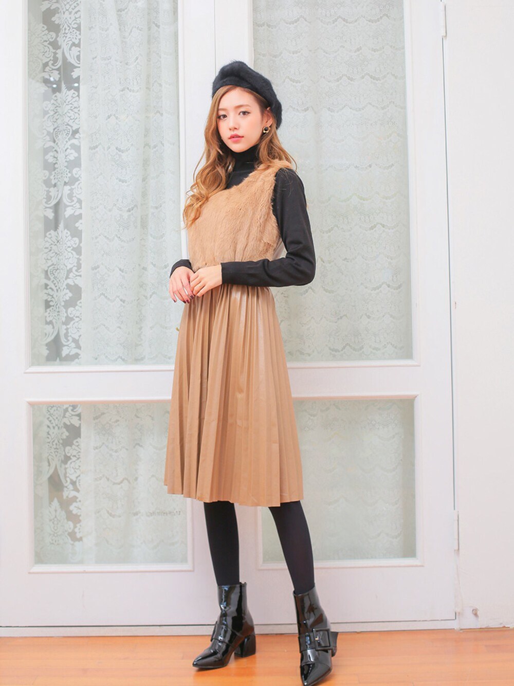 【スリーブレスリアルウサギファーワンピース】 上体部分が完全に高級感のあるリアルウサギの毛素材でデザインされていて クオリティを高め保温性も高めたワンピースアイテムです。 リアルウサギの毛とトレンディなしわスカートの出会いが魅力的なワンピースアイテム! 価格比ハイクオリティなワンピースにおすすめのアイテムです。 ベージュ、ブラック、グレー、すべての魅力的なカラー感で所蔵価値があります。 タートルネックと重ね着してコーディネートしたり、コートとマッチして着用すると、 今年の冬暖かく仕上げすることができるアイテムです。