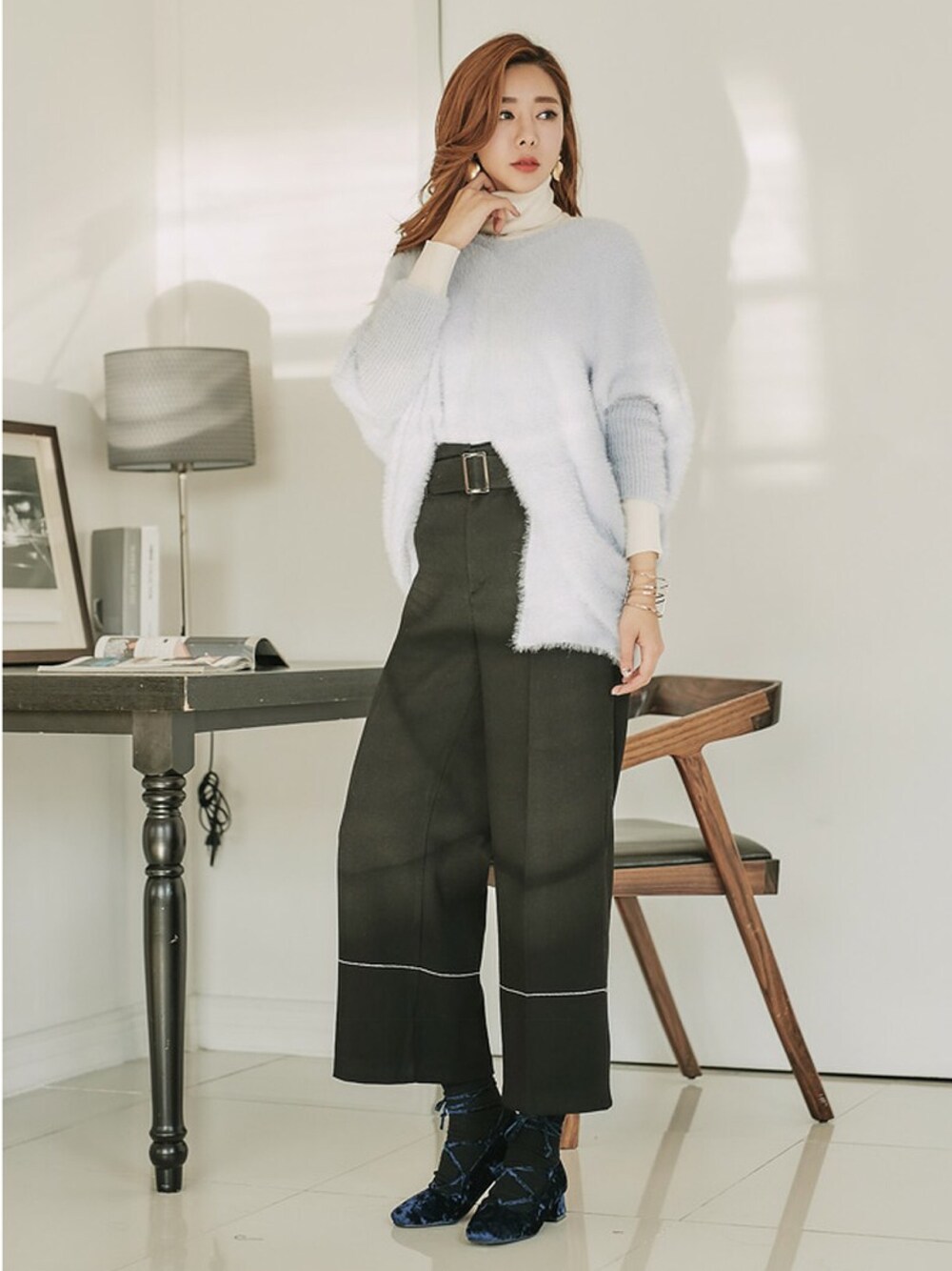 【ベルトSETハイウエストワイドパンツ】 女性らしさを高めたベーシックなワイドパンツです。 真っ直ぐゆったりと落ちるシルエットで、ベルトがセット! 脚のラインをスマートに演出して、高級感を高めたお作りが自慢です。 すそはばのステッチが可愛いなポイントです。 とろみブラウスとベルトをセットで 合わせて厚手のニットカーディガンを ゆるっと羽織ると女性らしいルックに。