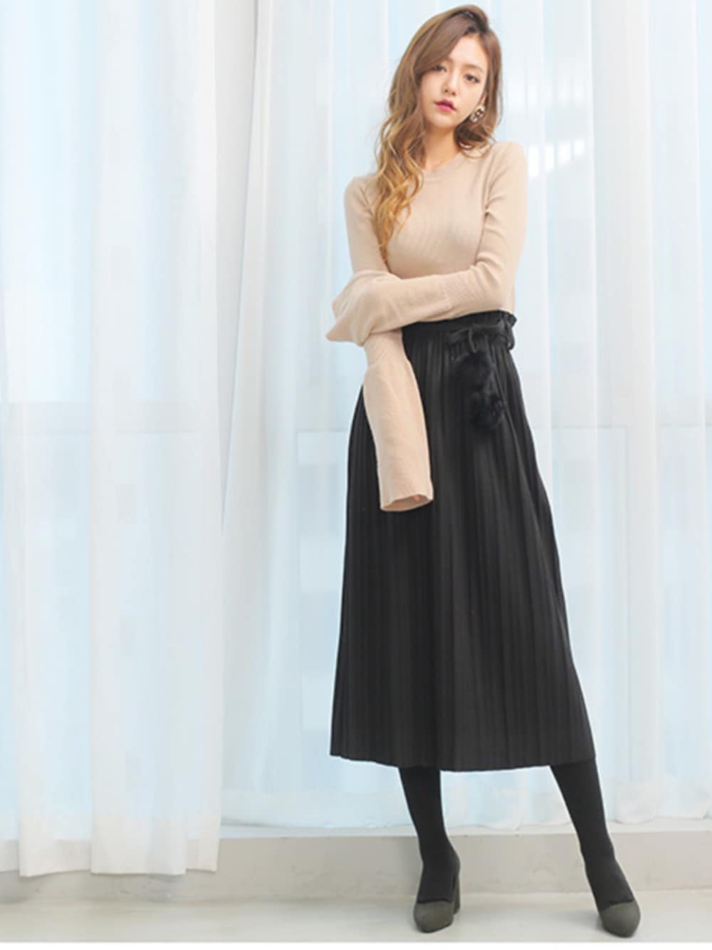 【スウェードライクボンボンプリーツスカート】 細めのプリーツの縦ラインで、 着痩せ効果を期待できるデザイン! さらに、程よい脚みせのミモレ丈で ヌケ感を与え、脚長効果と美脚効果を 同時に叶えてくれる優れたアイテムです。 肌触りもよく保温性も高いので、 寒い時期にもスカートコーデを楽しんでいただけます。 高級感のあるスエード素材です。