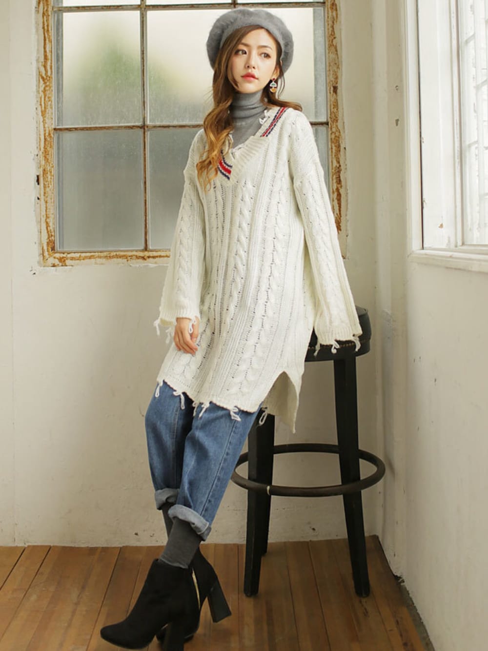 【ラインポイントVネックケーブルニットワンピース】 カジュアルムードを高める ラインポイントワンピースです。 全体的にゆったりと仕上がった シルエットでストレスフリーな 着用感を保ってくれるのが嬉しい。 Vネックを強調するダブル配色ラインは 非対称で独特な雰囲気を! リブ組みとケーブルの組みのマッチが魅力的なニットワンピース! ダメージディテールでエッジを効かせたかっこよさ。