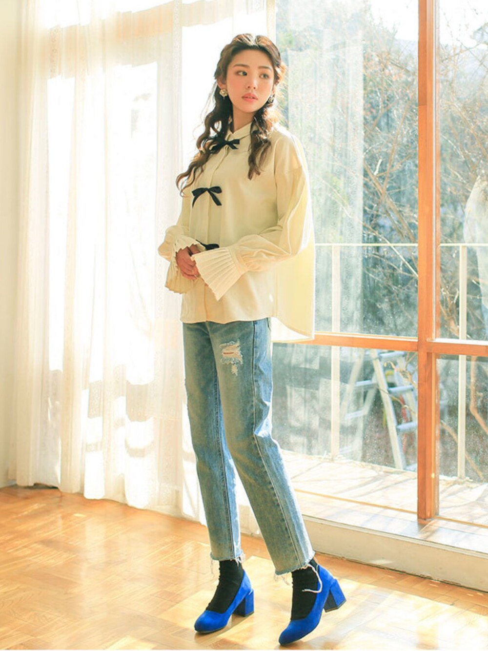 kormarchのシャツ/ブラウス「リボンポイントベールスリーブシャツ」を使ったコーディネート