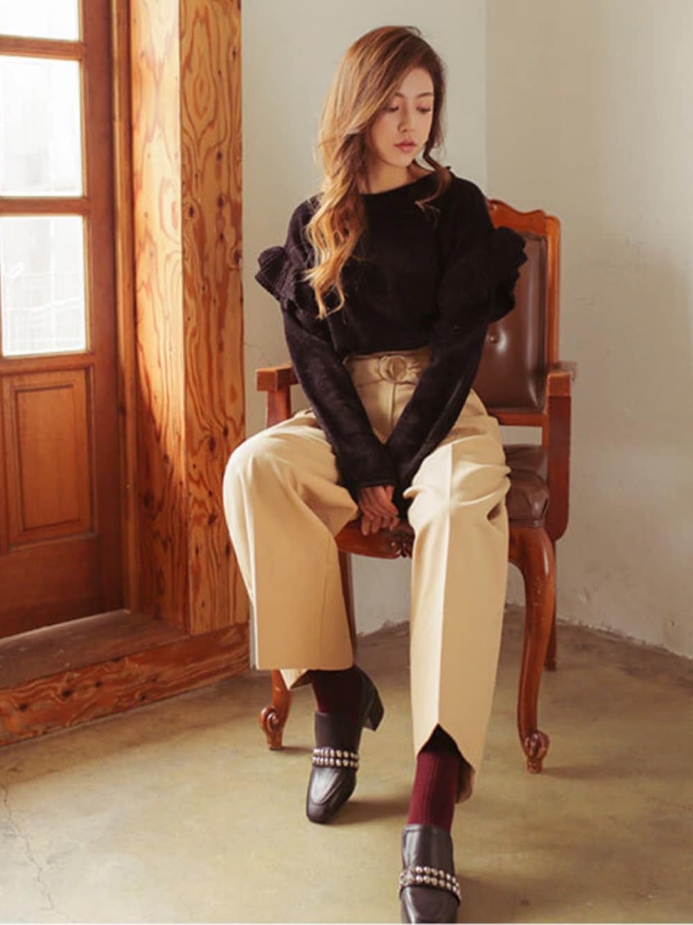 kormarchのニット/セーター「ショルダーティアードフリルリブトップス」を使ったコーディネート