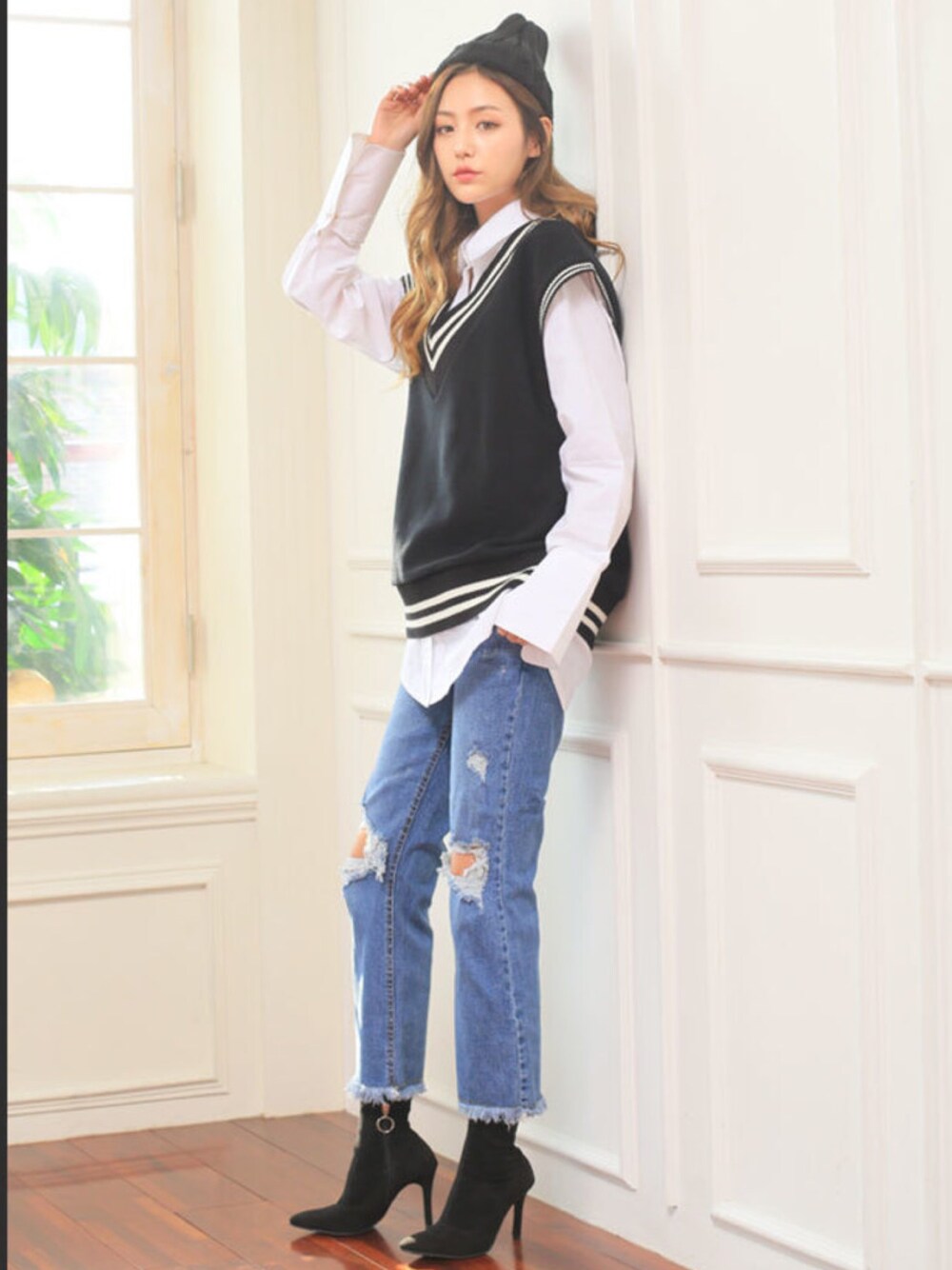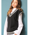 kormarchのベスト「カラーラインVネックニットベスト」を使ったコーディネート