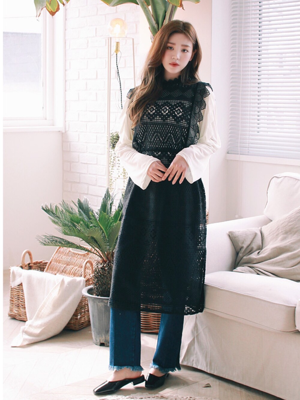 【スカラップヘムポイントレースワンピース】 シンプルなワンツーコーデに一枚羽織るだけでフェミニンルックが 楽しめるワンピースのご紹介です。 洗練美溢れるレース仕立ての愛らしいムードがルックの主役に! ネックラインとサイドにレースのスカラップヘムがポイントとなり、 ウエストゴムもポイント。 ウエストのラインを強調できます!