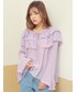 【ネックストラップラッフルブラウス】 様々な角度であしらった大胆な ラッフル使いがラブリーなブラウス。 ボリューム感溢れる仕上がりが、 細身のボトムと相性抜群です! ポリ素材の軽さでよりナチュラルに。 袖までフレアのディテールがデザインされて ラブリーな雰囲気をアップしたブラウスです。 大ぶりのラッフルをあしらった ショルダーラインにストリングを 加え調節で演出しやすいお作りに。