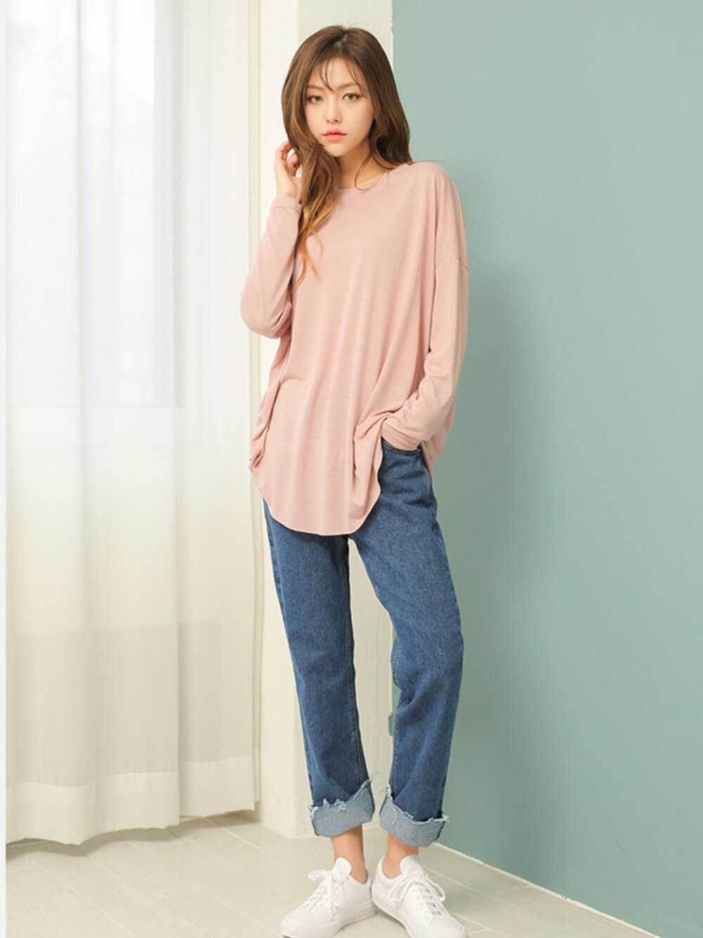【5色ベーシックデイリーラウンドネックTシャツ】 ゆったりめのオーバーサイズで気負わず着用できる長袖Tシャツです。 女性らしく優しい雰囲気を演出してくれるUネックデザイン。 ゆるっと感が今っぽく、シンプルながらもトレンド感をしっかり取り入れたデイリーアイテム! 裾部分はラウンドのデザインで、そのまま着用してもこなれ感のある お洒落な着こなしに仕上げてくれます。 しなやかかで柔らかい生地なので重ね着もしやすく、レイヤードアイテムとも相性抜群です。 カジュアルからキレイめまで、コーディネートの幅が広がる使い勝手のよい優れた一着です。