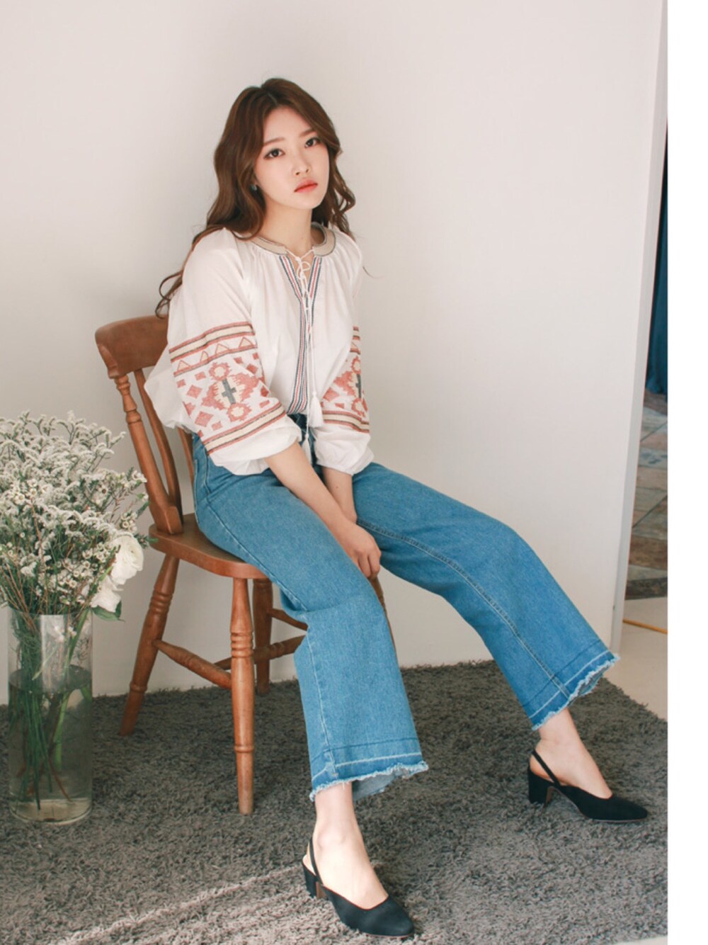 【タッセルネックストラップ刺繍ブラウス】 エスニックパターンが一目で印象的な お洒落さん必見のアイテムです。
