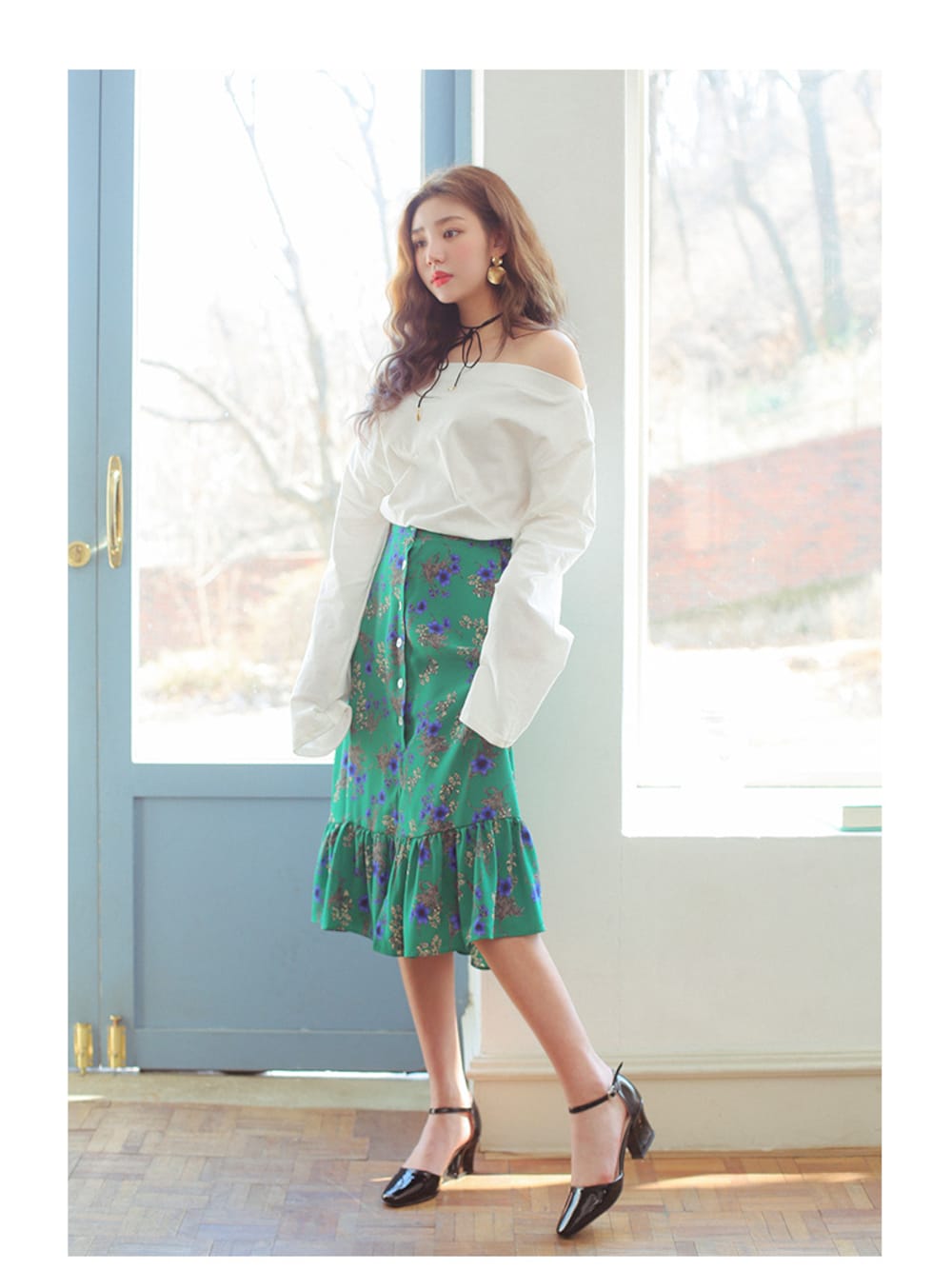 kormarchのスカート「フラワーパターンボタンポイントスカート」を使ったコーディネート