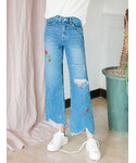 刺繍ポイントについ目が行くトレンディなデニムパンツ! ヌケ感がたっぷり詰まった繊細なディテールがクオリティ高めます。 足のラインも修正してくれる一本。 裾、膝のカットポイントでユニークなトレンディーさプラス 大胆なダメージを与えています* ポケットで実用性も高まりました。