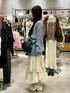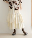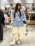 水色ニットが主役!ガーリーコーデ🎀🪄 淡い水色とフリンジデザインが可愛いニットは、ゆったりシルエットでとっても着やすいです!アクリル素材なのでお手入れも簡単で毛羽立ちにくいので長く着て頂けます◎✨ スカートはアシンメトリーに重なっているティアードデザインなので、動く度に揺れて可愛いです!🫶🏻💫ウエストも全部ゴムなので楽ちんに着ていただけます!!