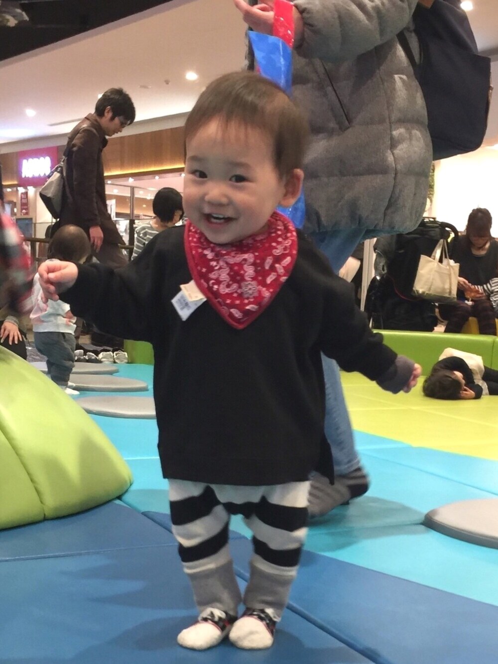 雨の日にやたら行くイオンにて撮影 ちょけた顔しよる😂 息子が産まれる前に奥さんが買ったズボンが良いサイズ感になってきた