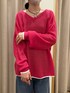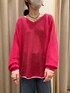 リネン100%の鮮やかなニットはシンプルにデニム合わせ! ニットの袖口と裾のラインに合わせて足元はホワイトに🤍