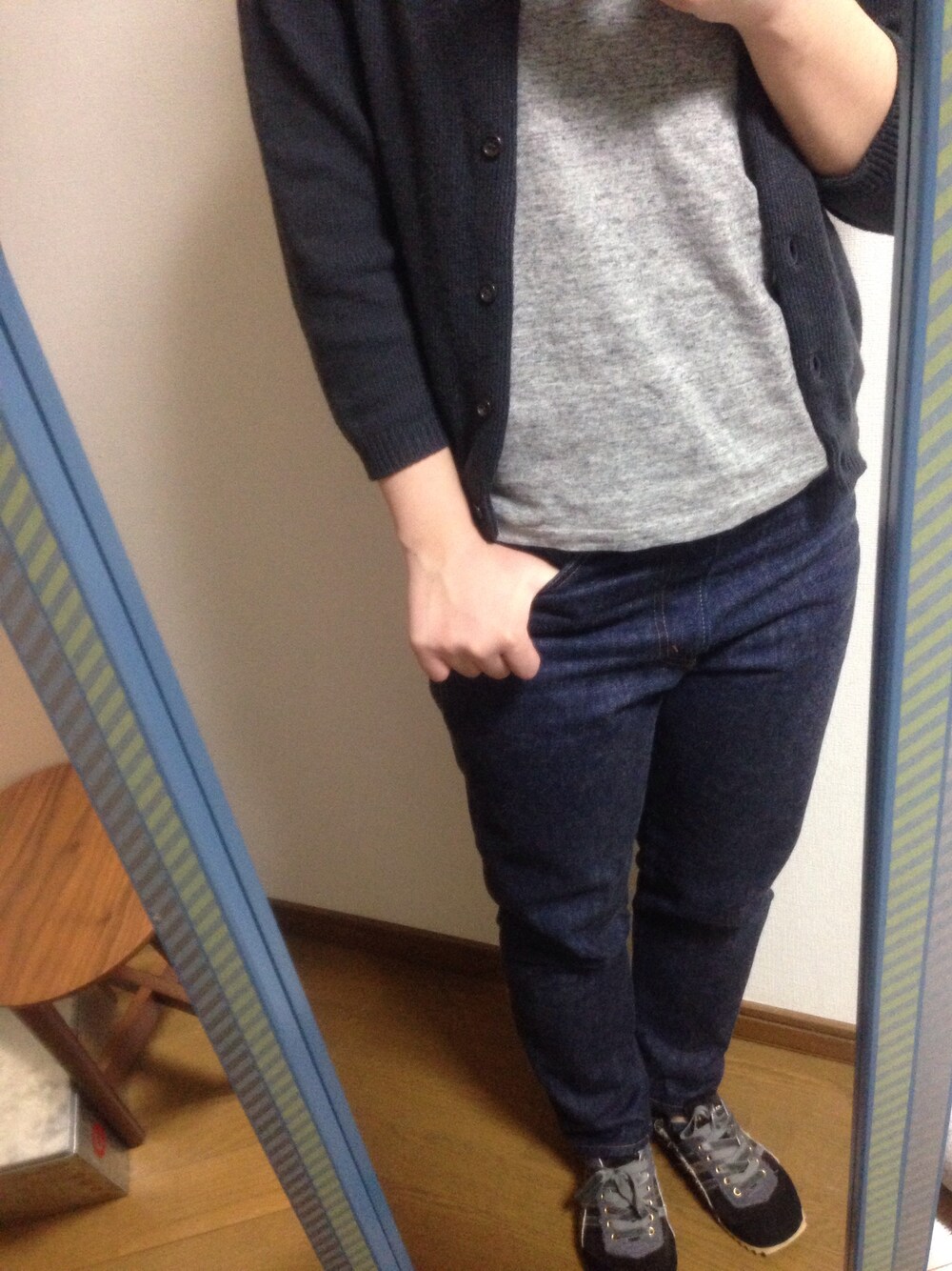 シンプルデニムスタイル。 レイビームスのTシャツ、気に入って追加で2枚購入しました。