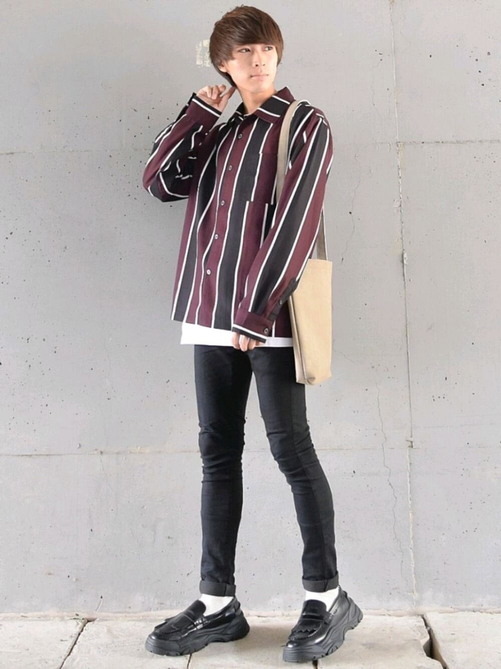 ユウくんとNilwayのコラボシャツコーデ✨ ワインレッドのストライプ柄は俺得ですね!😳✨ Lサイズ着用しています! 気になる方は是非チェックしてみてね😊✨ ☑️Instagram▶kose_wear ( ´ ꒳ ` )ノ